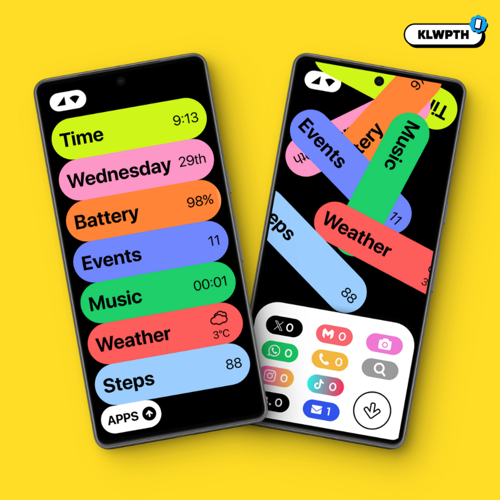 This setup is also part of the KLWPTH - MEGA BUNDLEAs you navigate your daily tasks, these rounded blocks not only serve as visually appealing shortcuts but also create a sense of order and creativity on your home screen. Opening your app drawer becomes a delightful surprise – watch as the colourful blocks elegantly slide aside, revealing a neatly organized array of your favourite applications.