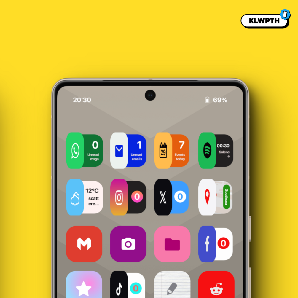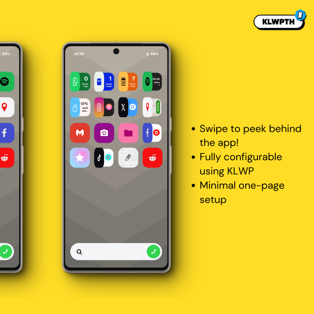 This setup is also part of the KLWPTH - MEGA BUNDLETake a sneaky peek at your favourite app's notifications or functions with this minimal, easy-to-use one-page homescreen setup.