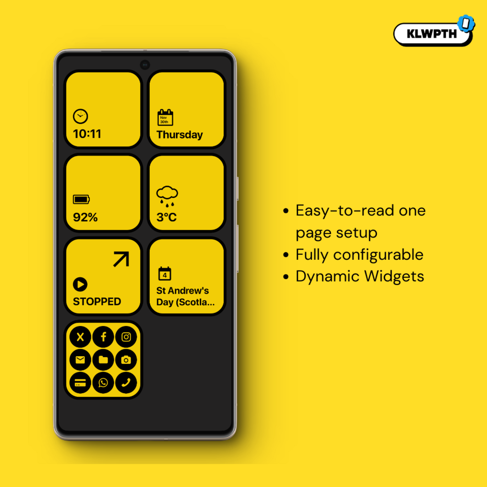 This setup is also part of the KLWPTH - MEGA BUNDLEFeaturing seven dynamic block widgets, each adorned with eye-catching yellow road signs. These widgets seamlessly blend functionality with aesthetics, transforming your home screen into a dynamic dashboard of essential information.